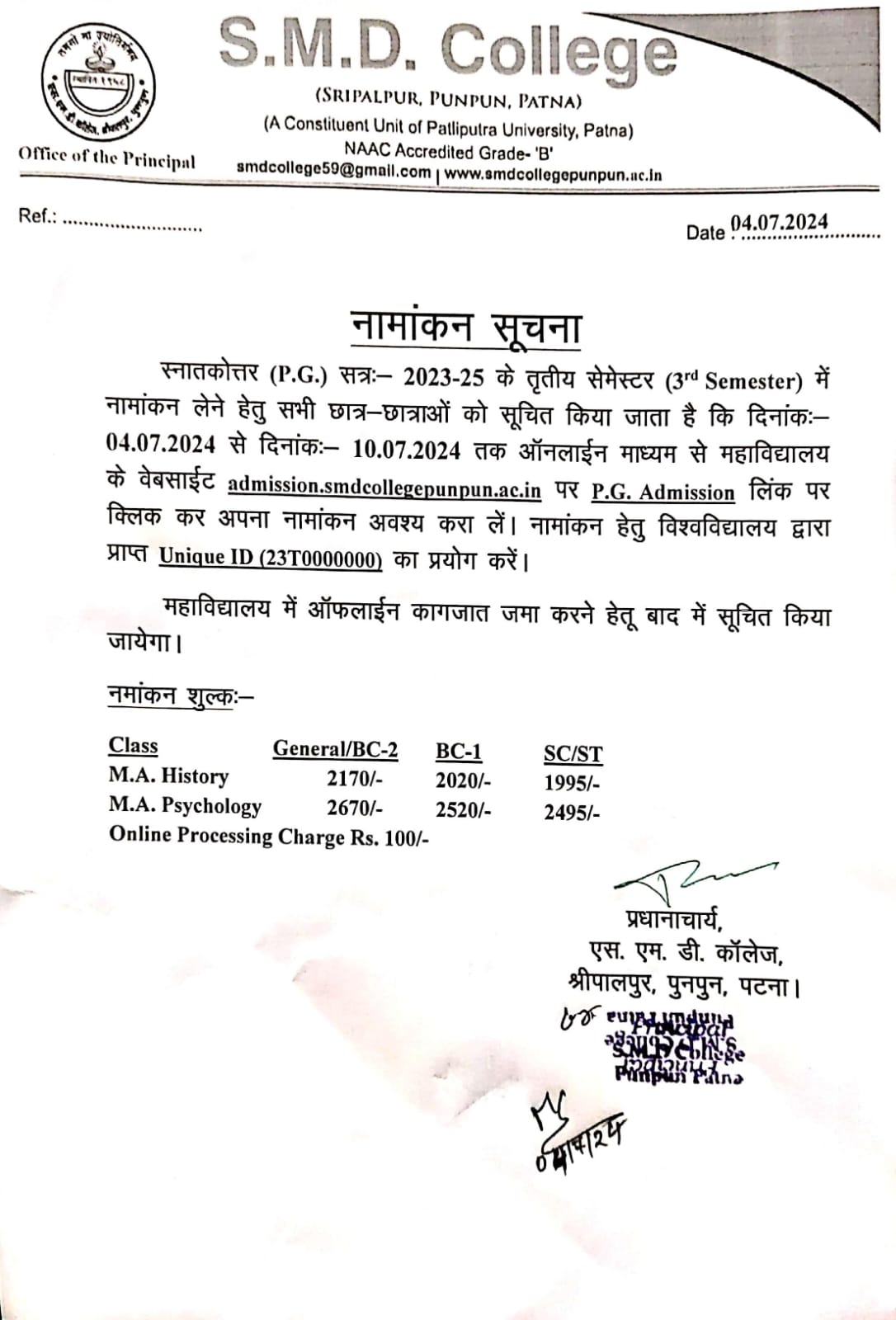 NOTICE REGARDING PG 3RD SEMESTER ADMISSION (2023-25)
