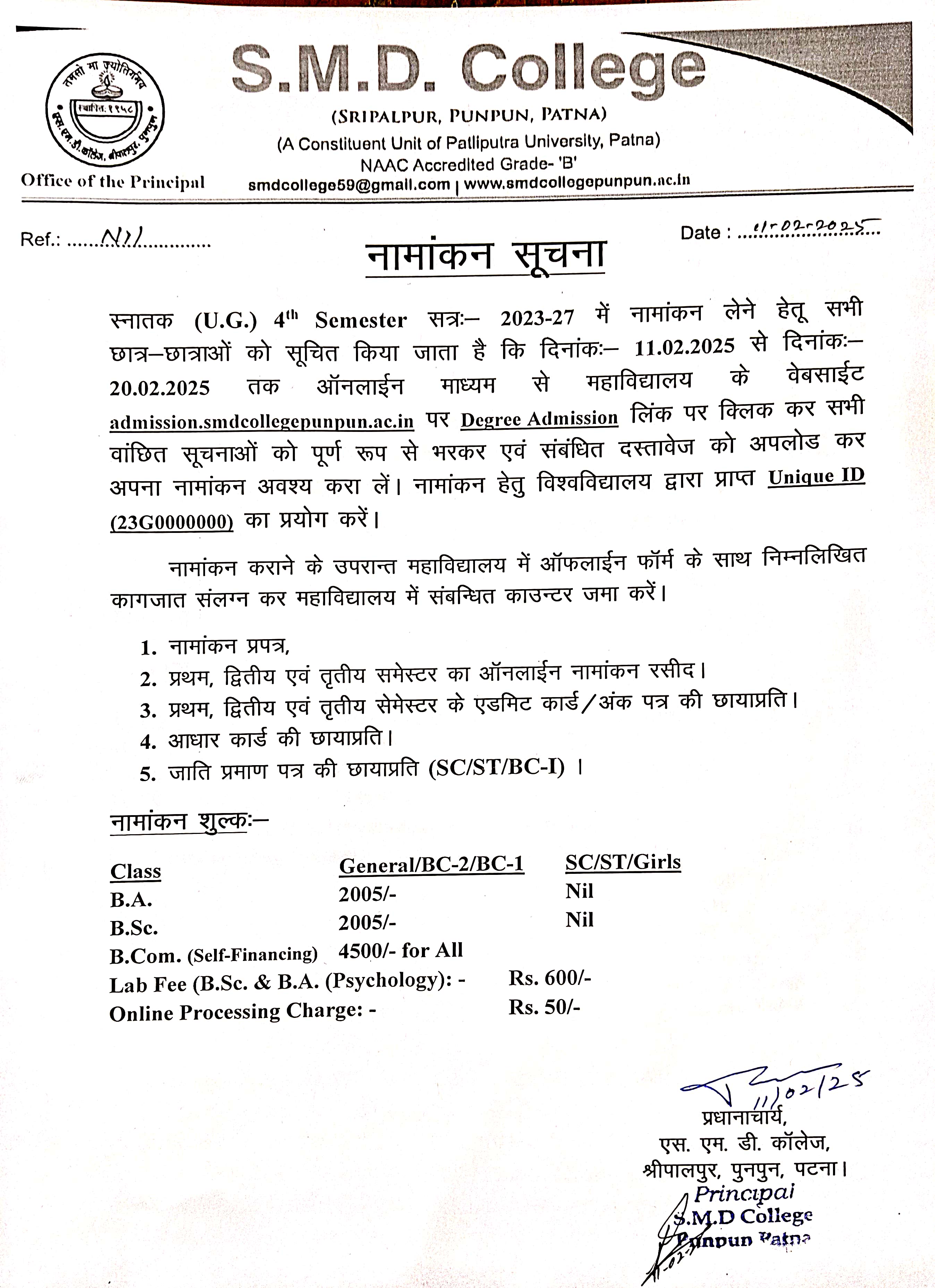 NOTICE REGARDING UG 4TH SEMESTER ADMISSION (2023-27)