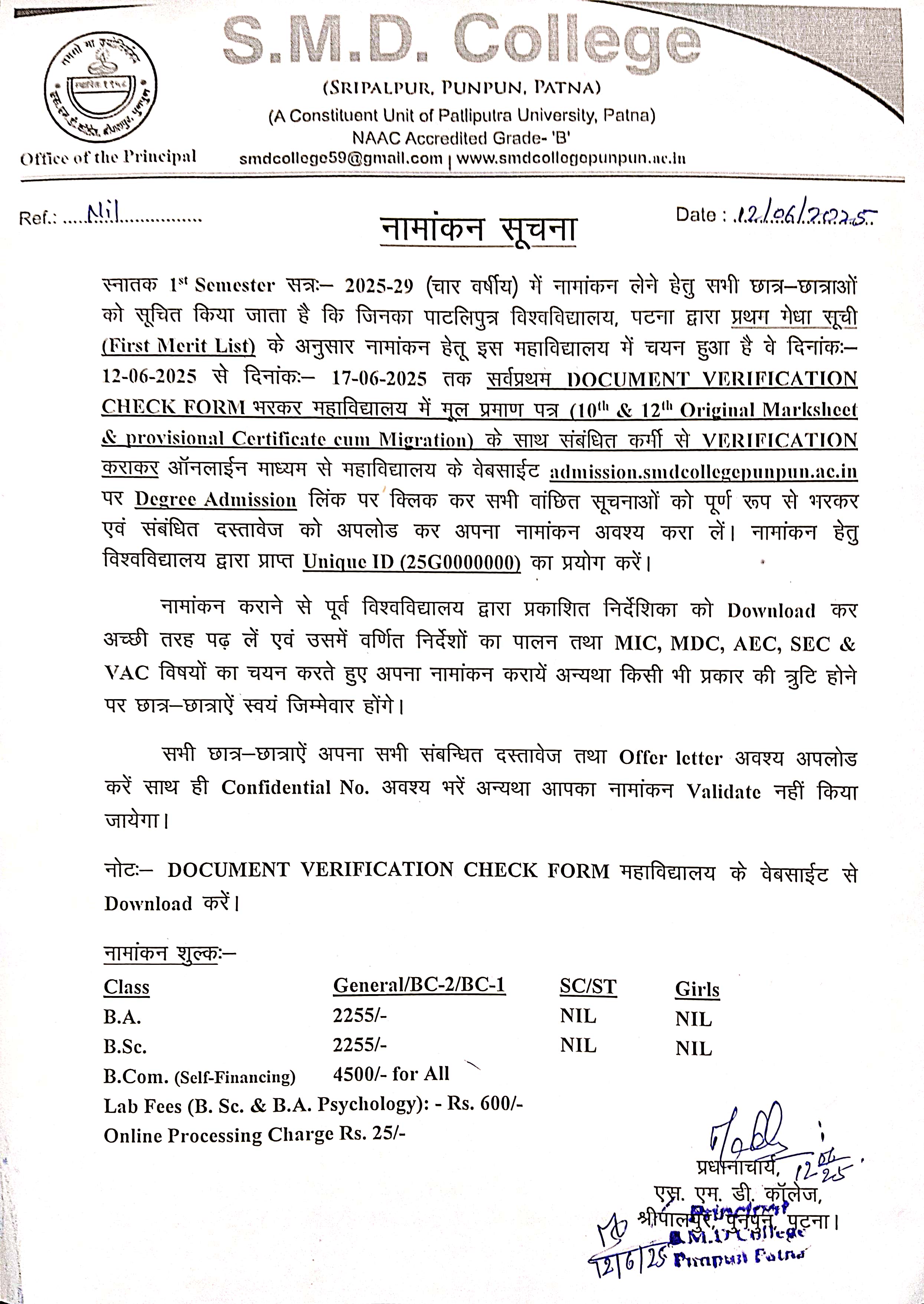 NOTICE REGARDING UG 1ST SEMESTER ADMISSION 1ST LIST (2025-29)