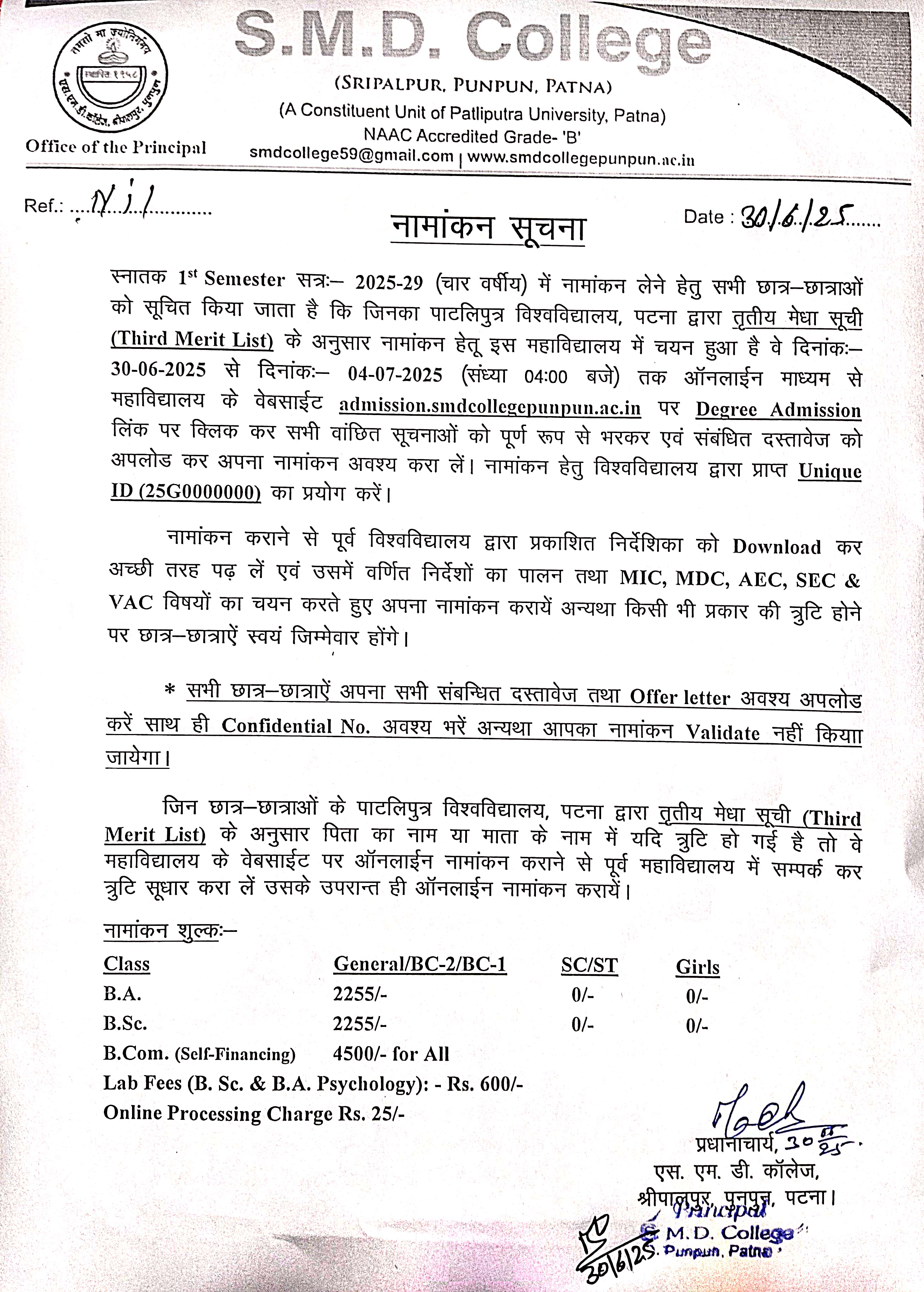 NOTICE REGARDING UG 1ST SEMESTER ADMISSION 3RD LIST (2025-29)
