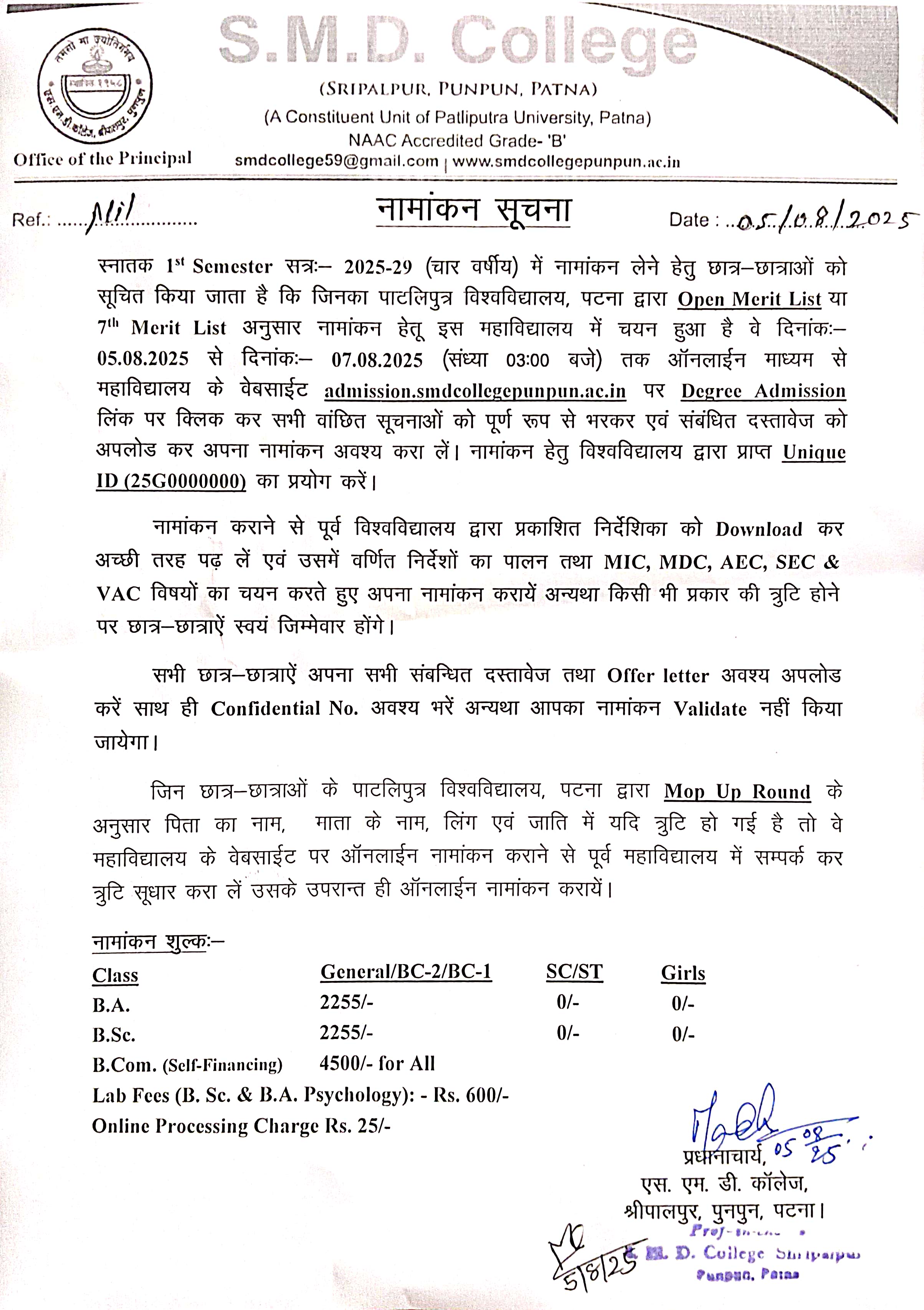 NOTICE REGARDING UG 1ST SEMESTER ADMISSION 7TH LIST (2025-29)