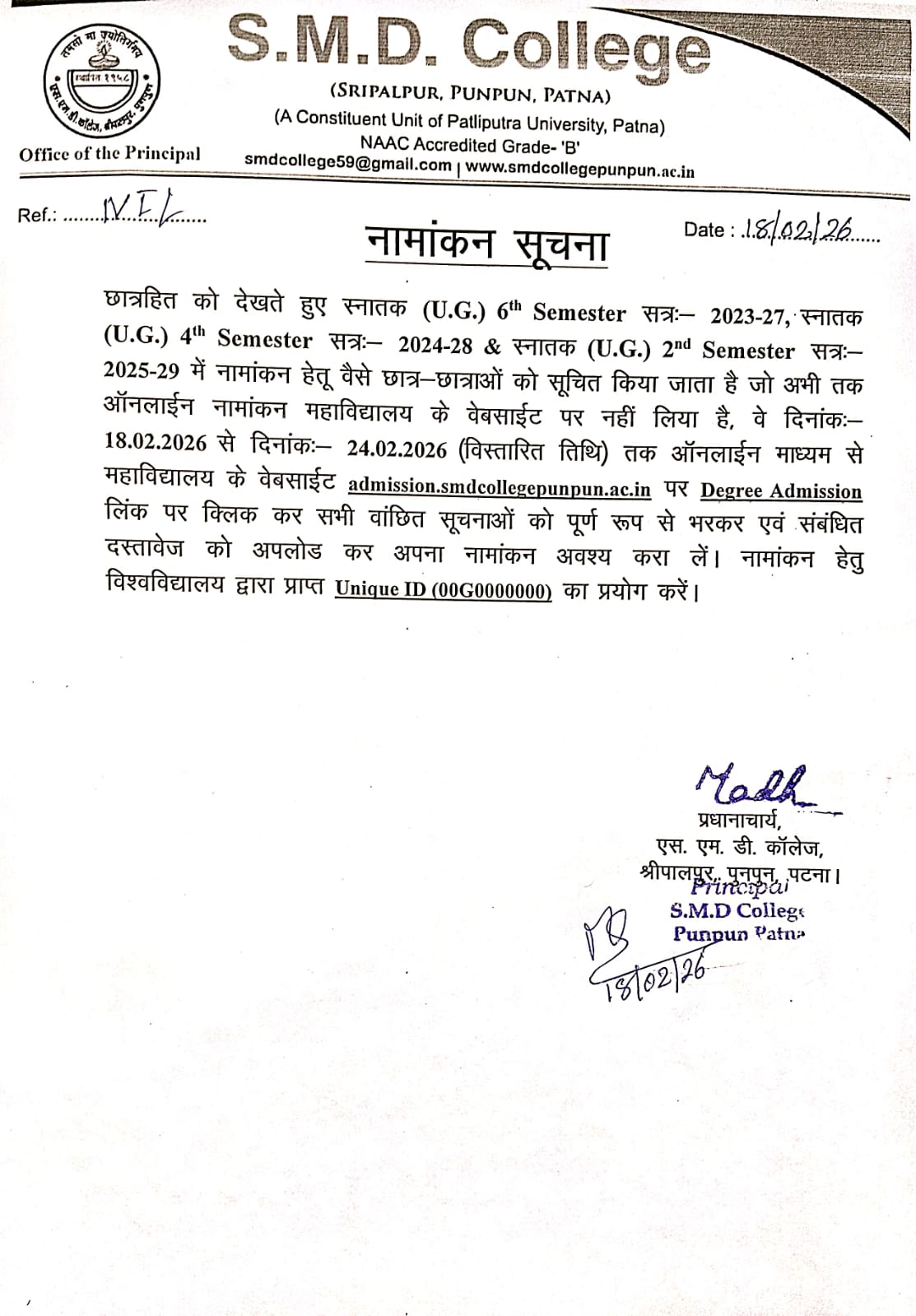 NOTICE REGARDING UG 2ND SEMESTER (2025-29) & 4TH SEMESTER (2024-28) AND 6H SEMSETER (2023-27) ADMISSION DATE EXTENDED OF 24-02-2026