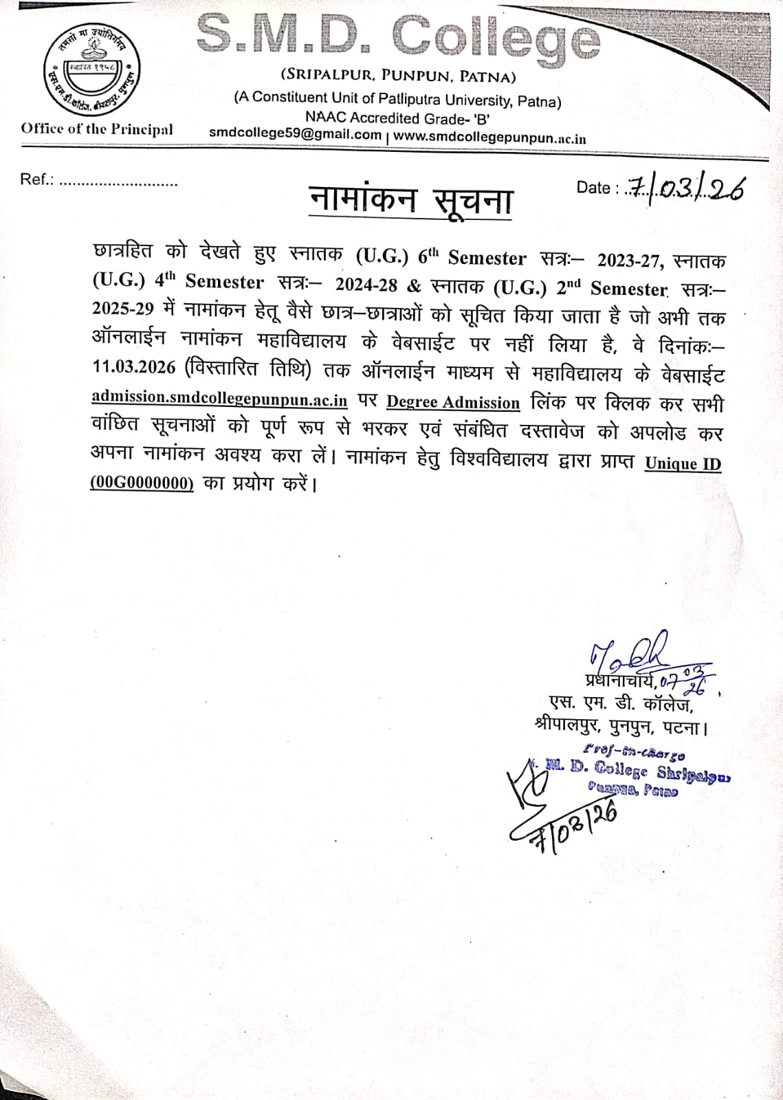 NOTICE REGARDING UG 2ND SEMESTER (2025-29) & 4TH SEMESTER (2024-28) AND 6H SEMSETER (2023-27) ADMISSION DATE EXTENDED OF 11-03-2026